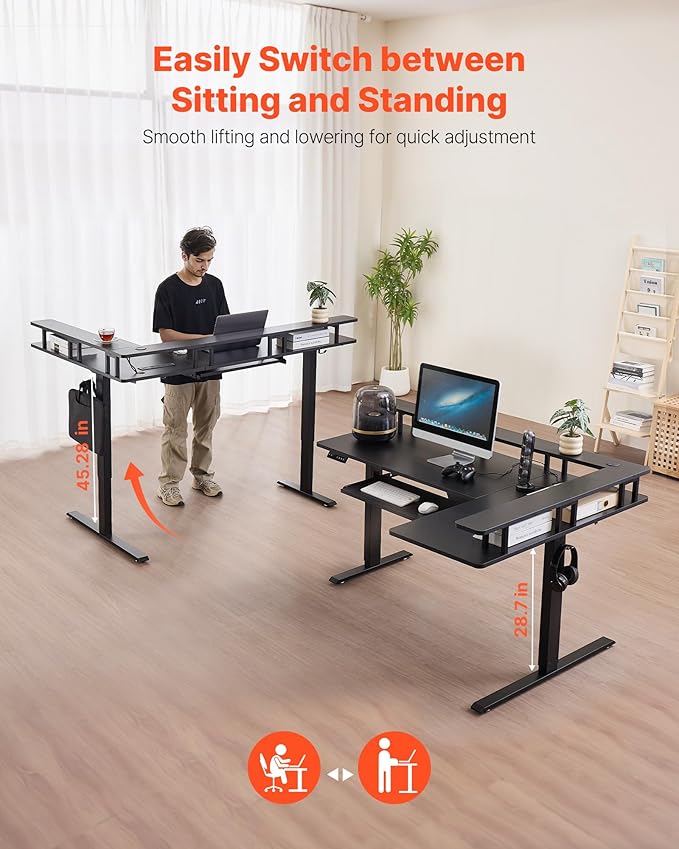 - Smart Electric Height Adjustment: Our electric L-shaped desk supports height adjustments between 28.7-45.28 in / 72. 9-115 cm, allowing you to easily customize the desk height to your needs. Seamlessly switch between sitting and standing to reduce the fatigue of prolonged sitting, promoting a more efficient work environment