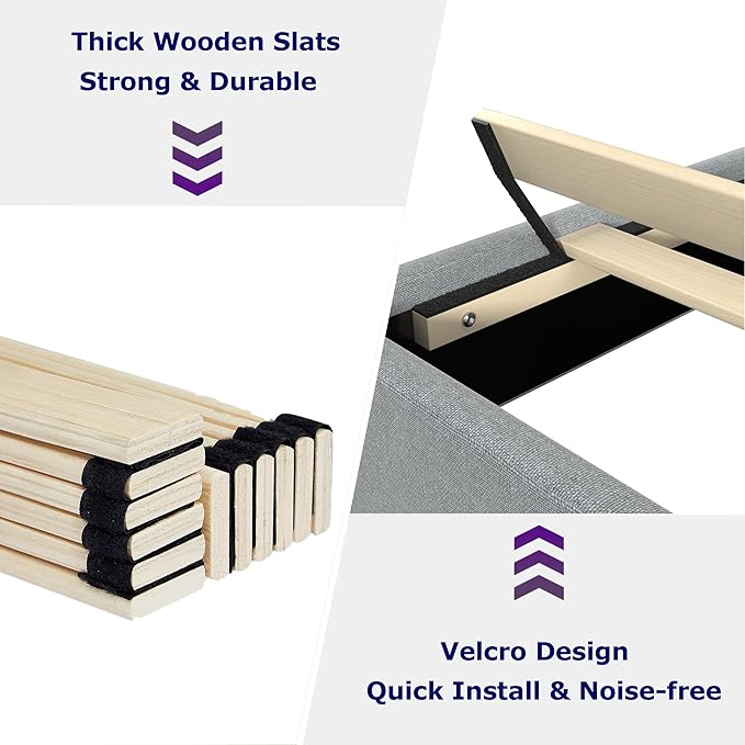 - [NOISE-FREE DESIGN] The slats of this bed frame queen size are specially designed with velcro to prevent friction. In addition, the foot of the upholstered queen size bed with non-slip foot pads protects the floor and reduces noise, creating a quiet and comfortable resting environment for you.
