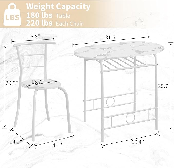 VECELO 3-Piece Dining Table Set for Kitchen Breakfast Nook, Faux Marbled Oval Tabletop and Metal Frame with Built-in Wine Rack, for Small Spaces, White
