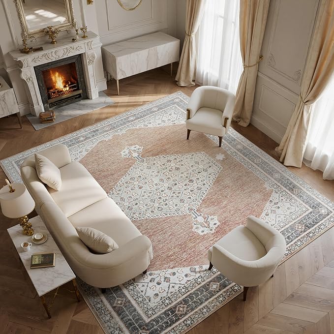 Washable Rugs 8x10 Area Rugs for Living Room,Bedroom,Dining Room- Soft Low Pile Stain-Resistant Carpet with Non-Slip Rubber Backing,Large Vintage Area Rug for Nursery Home Office Decor