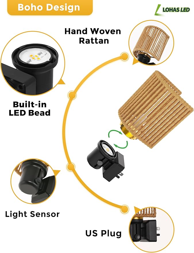 - Decorative Boho Night Light -- The natural material shade woven by skilled craftsmen is combined with the high quality plastic base to create a romantic Boho atmosphere, adding a different atmosphere and style to the indoor space.