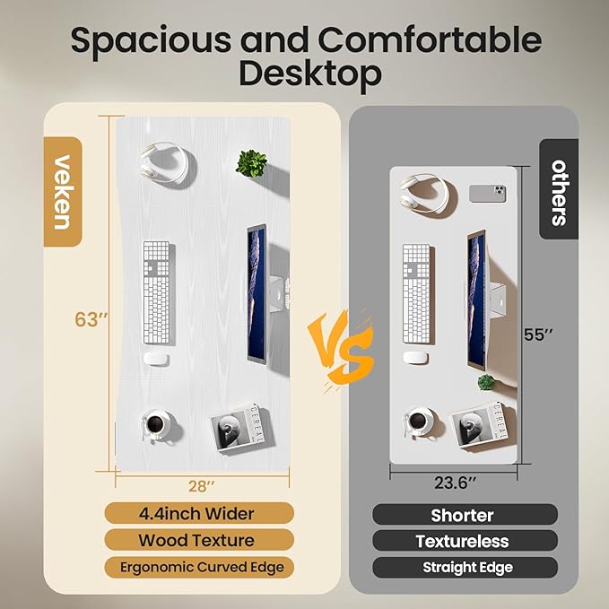 Veken 63 x 28 Inch Electric Standing Desk, Sit to Stand Up, Work Home Office Computer Table for Study, Walking Pad, Writing, and Games, Wooden Desktop Desks, White
