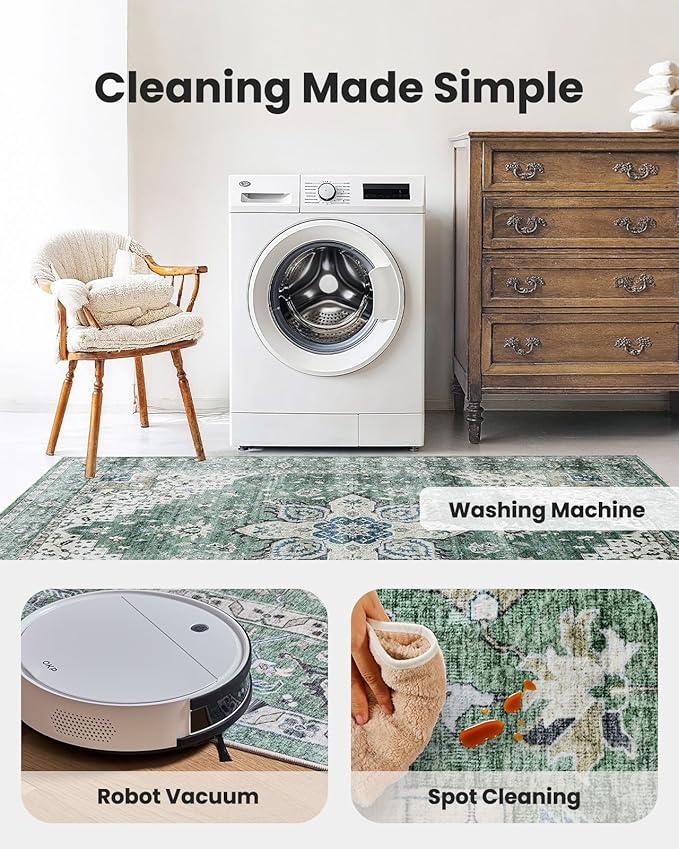 - Machine Washable: The short pile design of this washable rug is easy to maintain using an upright vacuum or robotic vacuum cleaner. The area rug is also machine-washable for fast and hassle-free cleaning. After washing, a low-temperature iron can help to keep the living room carpet’s surface flat and smooth.A