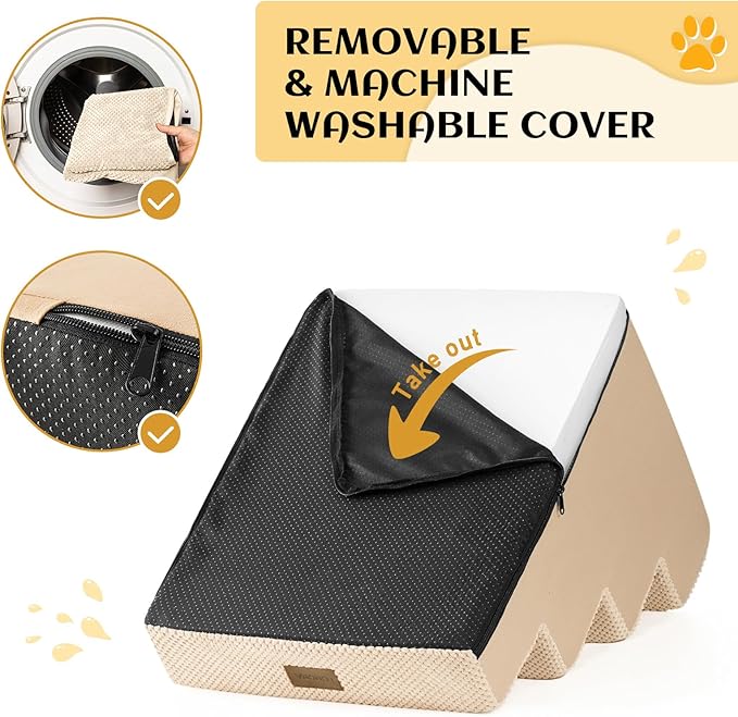 - Non-Slip Base and Removable Cover: Our dog steps for beds are equipped with a non-slip base featuring rubber dots for additional grip, minimizing movement during use. The pet steps cover is waterproof on the inner side, so you don’t have to worry about stains seeping into the foam. The outer cover is removable and machine washable for easy cleaning