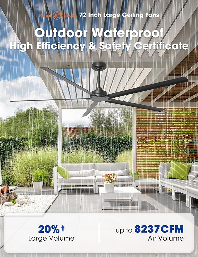 - 72" Extra Large Outdoor Fan – Massive 72-inch diameter delivers ultra-wide air circulation, ideal for large spaces like patios, porches, garages, pergolas, or covered decks. Modern minimalist black finish matches any outdoor or industrial décor.