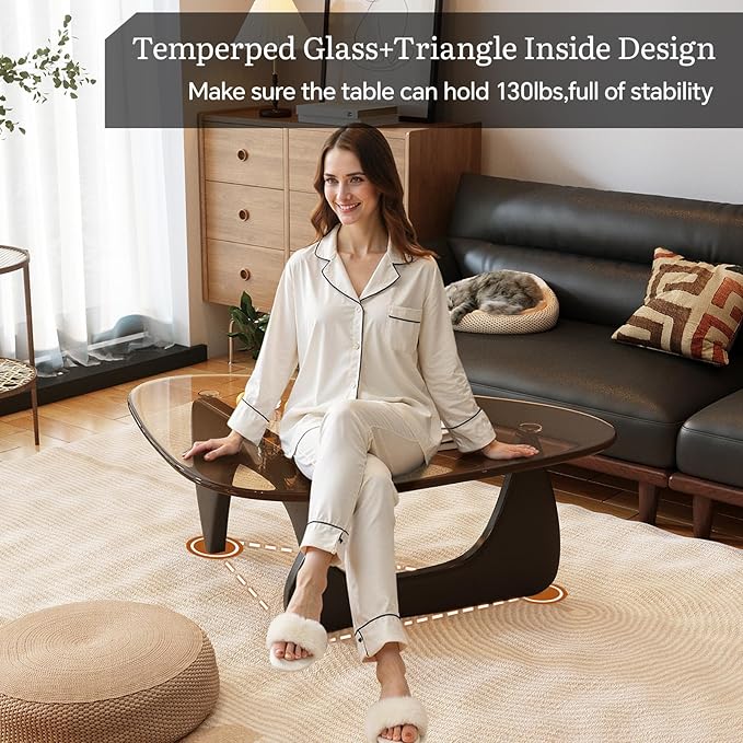 - πΊγππππππ πππππππππγThe unique triangular base (walnut + oak) of this living room table with premium glass not only adds visual interest but also provides exceptional stability. Built to withstand daily use for 130 lbs, ideal for placing drinks, books, or decor without wobbling.