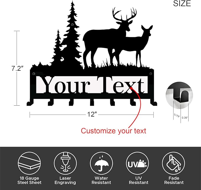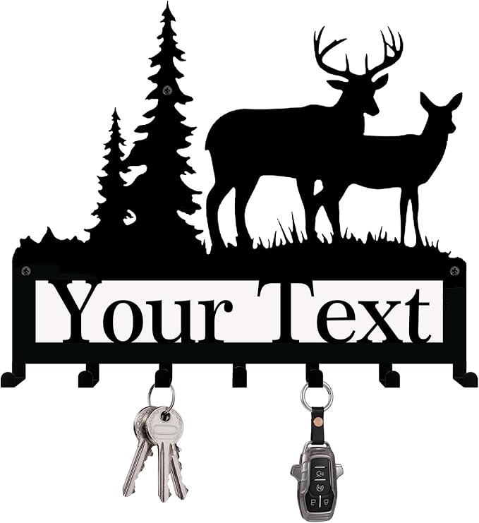 - Personalized Family Key Holder: Customize this wall-mounted key holder with your family name, couple's initials, or a short message. Featuring a beautiful forest and deer silhouette design, this unique woodland-themed key hook is perfect for hunting enthusiast families and makes an ideal gift for hunters, husbands, or dads