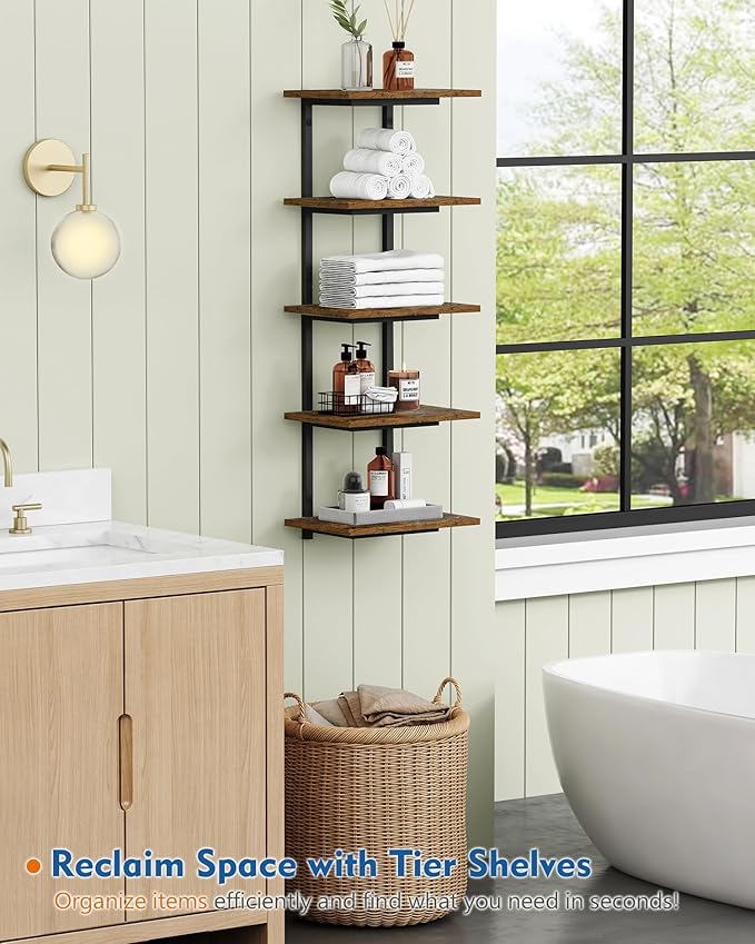 5 Tier Wall Bookshelf Unit for Bedroom Books, Large Floating Book Shelves Wall Mounted, Rustic Wood Lack Tiered Hanging Shelf for Kitchen Office Living Room Corner (Dark Brown)