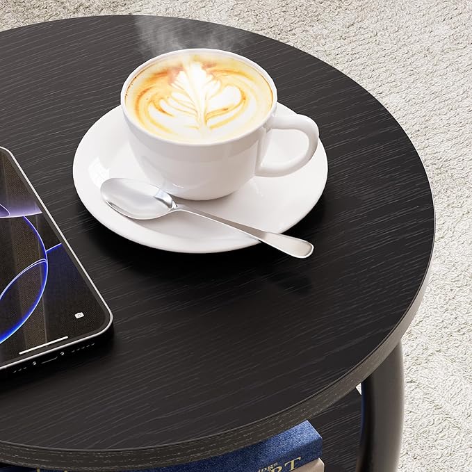Small Round Side Table, 3-Tier End Table with Storage Shelf, Slim Sofa Table Coffee Table, Sturdy & Easy Assemble Nightstand for Small Spaces, Living Room Bedroom Corner, Black