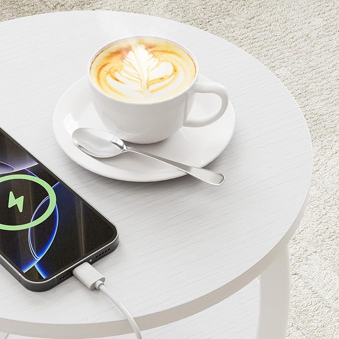 Round Side Table with Power Outlet & USB Ports, 3-Tier End Table with Storage Shelf, Modern Rustic Nightstand, Small Spaces Accent Table for Living Room Bedroom, Easy Assembly, White