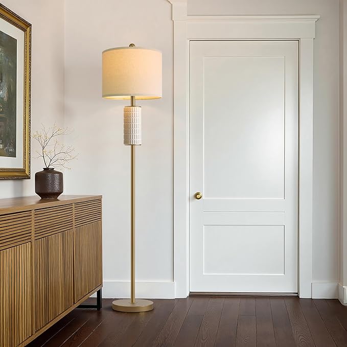 - 【Modern Lamp for House Decor 】 Standing at 64 inches tall, perfect height for Standard rooms. This standing lamps for living room features a easy-to-reach rotary switch suits both reading needs and home decoration. Designed with a beige-white ceramic and antique gold metal pole, this mid century antique gold floor lamps adds a touch of elegance to various spaces—including living rooms, bedrooms, hallways, home offices, study areas, entryways, and dining room corners. Equipped with a linen lampshade that emits soft, comfortable light, this living room lamp works perfectly beside reading chairs, sofas, recliners, and armchairs, as well as next to beds or potted plants.