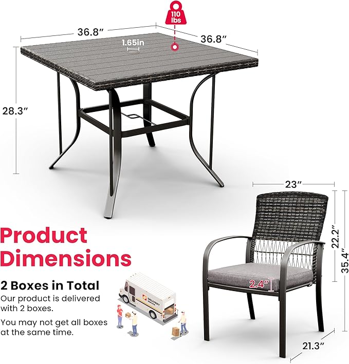- Versatile 5-Piece Set: Includes 1 square table + 4 rattan chairs for stylish gatherings. Ideal for patios, gardens, poolsides, or balconies—transforms any space into a cozy retreat.