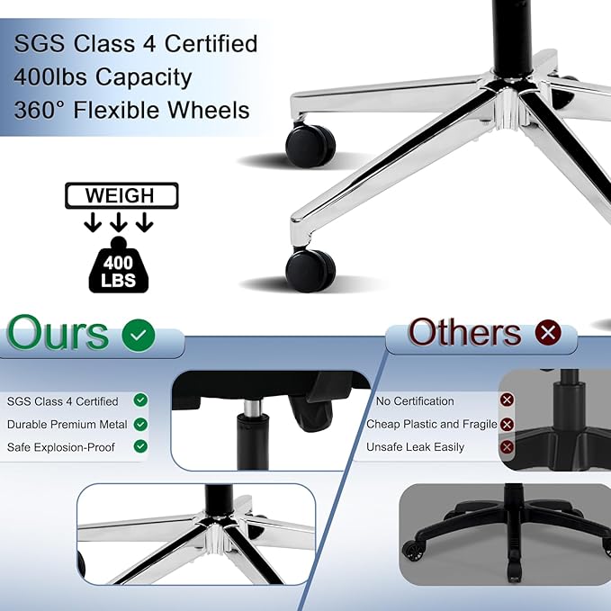 - 【400 LBS Weight Capacity Integrated Metal Base】Different from other spliced bases, our office chair base is made of one-piece metal with a load-bearing capacity of 400lbs, and certified by BIFMA for safety and durability. The office chair chassis is equipped with five double -layer universal wheels to ensure the flexibility of the chair.