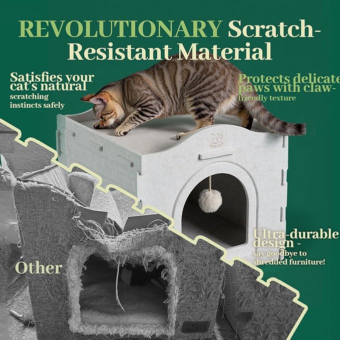 - INNOVATIVE POLYESTER FIBER MATERIAL Crafted from enhanced polyester fiber, this material offers a soft texture, exceptional durability, scratch resistance, warmth, breathability, and eco-friendliness. It comprehensively addresses common cat house flaws like material fragility, insufficient weight capacity, and odor retention, redefining feline comfort.