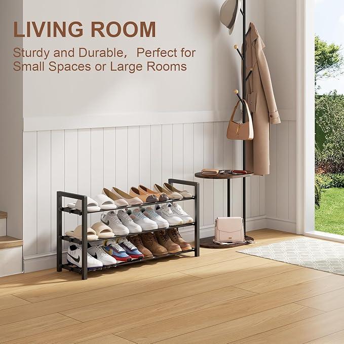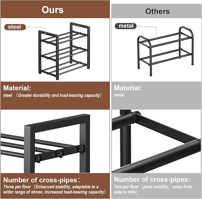 - š Sturdy 3-Tube Design for Enhanced Shoe Storage Features three reinforced middle tubes (vs competitors' two) to securely hold up to more pairs of shoes per tier without sagging. The robust square side tubes + round crossbar structure ensures 150lbs weight capacity ā perfect for heavy boots or multiple sneakers!