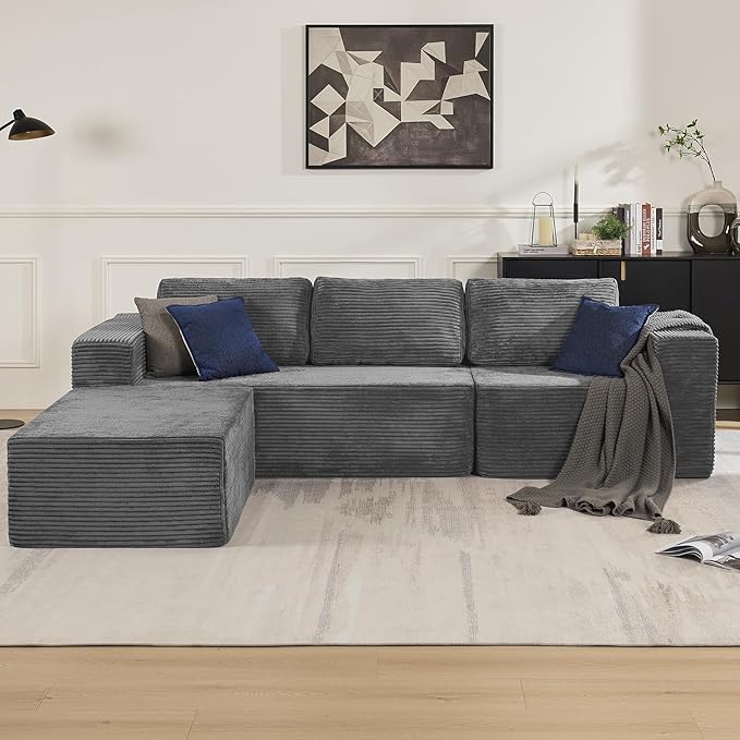 106" Modular Sectional Sofa with L-Shape Chaise, Right/Left Facing Deep Seat Cloud Couch, No Assembly Required, Upholstered Couch for Living Room Bedroom (Plush Corduroy Fabric, Grey)