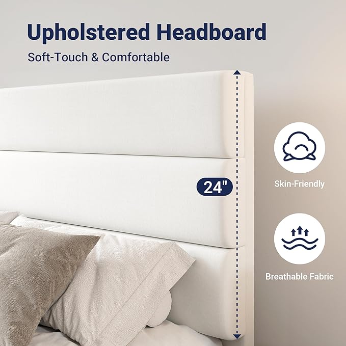 - Oversized Padded Headboard: The three‑panel,foam‑filled headboard on this king bed offers plush back support for reading or lounging, combining comfort and contemporary style in one statement piece