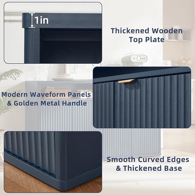 - [Unique Design]Overall dimensions: 15.4"D x 55.2"W x 31.9"H. This large sideboard with curved arc edges features 4 minimalist-style doors with fluted waveform panel, paired with elegant gold metal handles, adding a modern and sophisticated touch to dining rooms and kitchens. The wood-grained surface of the side board infuses your home with the breath of nature.
