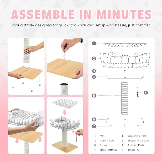 - MODERN, MINIMALISTIC AESTHETIC – Featuring clean lines and neutral tones, this scratching post integrates seamlessly into any home décor. Available in three elegant finishes—Black with Gray Bed, Black with Pink Bed, and Natural Wood with White Bed.