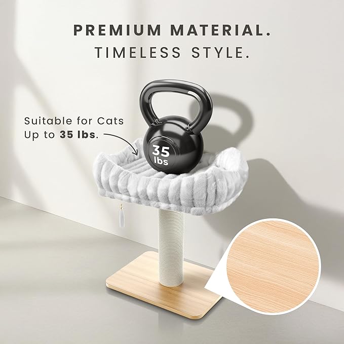 Modern Scratching Post for Indoor Cats - 15” High Cat Scratching Post with Bed Breeds - 15.7” x 11.6” Removable & Washable Cushion (Natural Wood Post with White Bed)