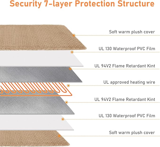 - 🐶Unique Safety Design: In order to prevent dogs from biting the wire and getting electrocuted, the wire is wrapped by spiral chewy cover. 7-layer protective structure with UL-certified heating wire protect pets from burns. Soft PVC envelope with waterproof and flame-retardant function. Built-in intelligent temperature sensor in the heating pad to prevent overheating to protect pets. Don’t let your pets lay on the pet heating pad without a plush cover.