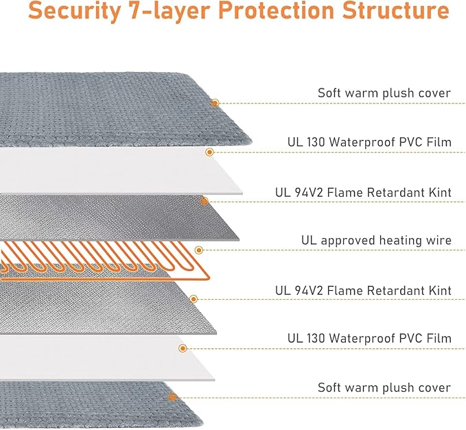 - 🐶Unique Safety Design: In order to prevent dogs from biting the wire and getting electrocuted, the wire is wrapped by spiral chewy cover. 7-layer protective structure with UL-certified heating wire protect pets from burns. Soft PVC envelope with waterproof and flame-retardant function. Built-in intelligent temperature sensor in the heating pad to prevent overheating to protect pets. Don’t let your pets lay on the pet heating pad without a plush cover.