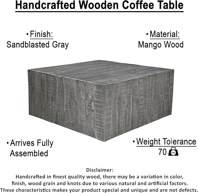 TUP THE URBAN PORT Rydan Coffee Table | 33 Inch Square Block Top | Sandblasted Gray Mango Wood