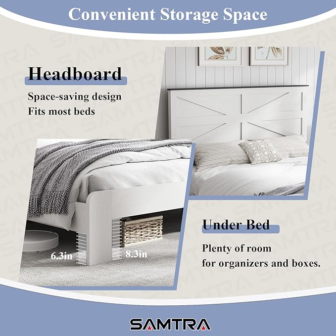 Wooden Bed Frame Queen Size with Headboard, Farmhouse Platform Bedframe with Wood Slat Support, Sturdy Framework Bed Frame, Easy Assembly (Rustic White)