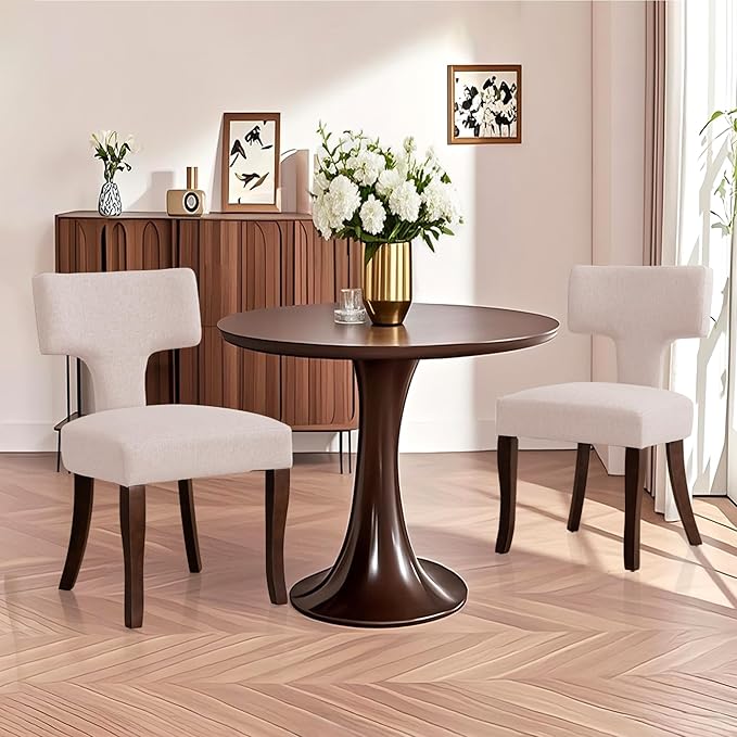 Mid Century Modern Dining Chairs Set of 2, Upholstered Side Dining Chairs with Curved Back Linen Fabric Armless Wood Chairs Kitchen & Dining Room Farmhouse Chairs (White)
