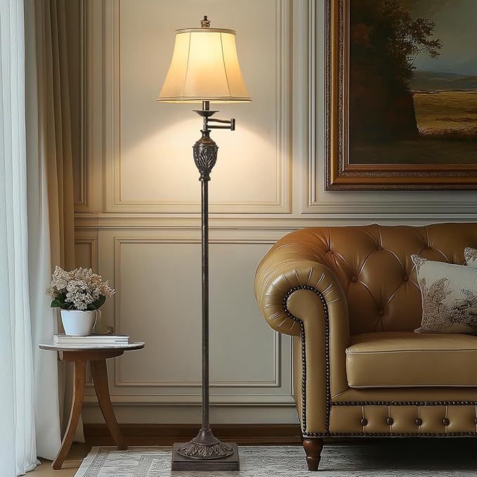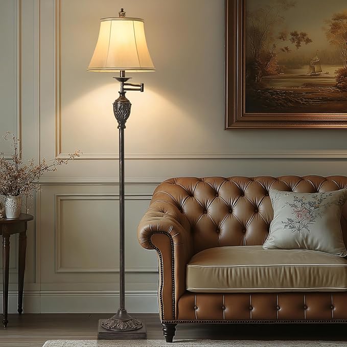 Traditional LED Floor Lamp with 350° Adjustable Swing Arm Lamp – Vintage Standing Pole lamp for Living Room, Bedroom and Office – Rustic Upright Floor Light for Home Décor with Faux Silk Fabric Shade