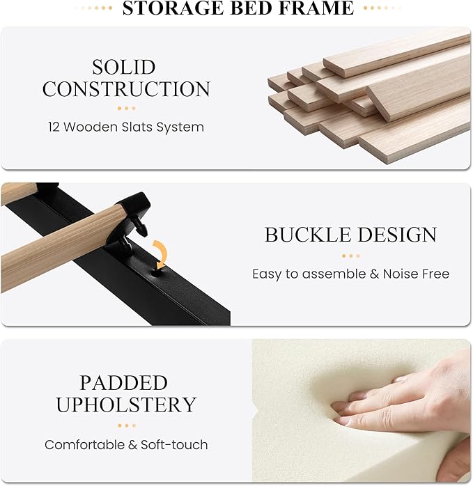 - Special Feature : Easy Assembly, No Box Spring Needed, Squeak Resistant, Storage Drawer, Upholstered
