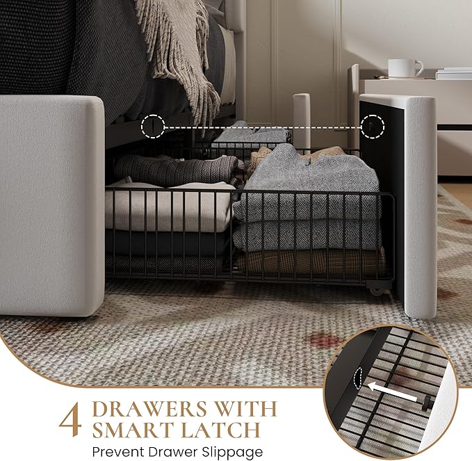 - Ample Under‑Bed Storage: Featuring 4 large built-in drawers mounted on smooth‑gliding wheels, this full bed frame ensures plenty of space to store your accessories