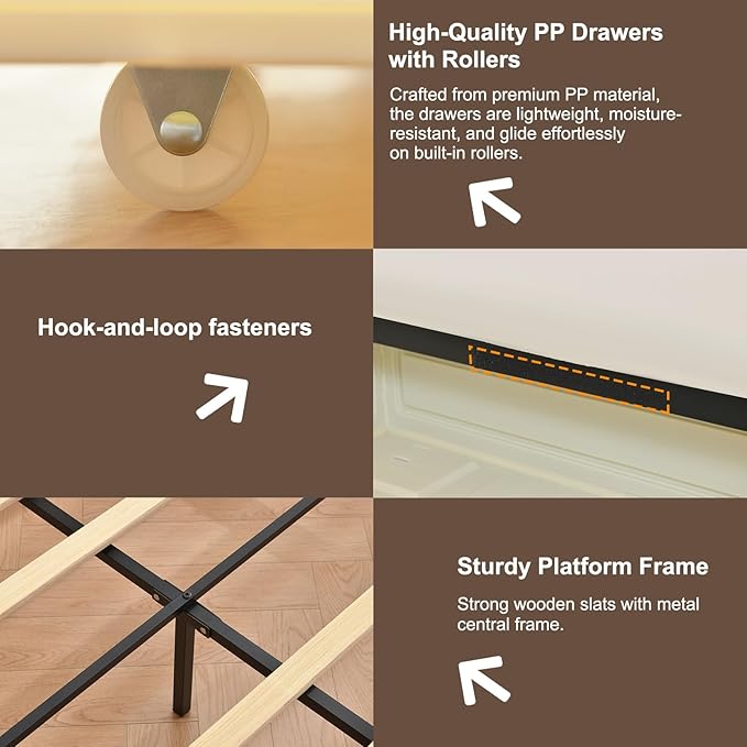 - 【4 Storage Drawers】Maximize your space with four large under-bed storage drawers equipped with smooth-rolling wheels for effortless access. Perfect for organizing bedding, seasonal clothes, or daily essentials, these drawers help keep your bedroom neat and clutter-free.