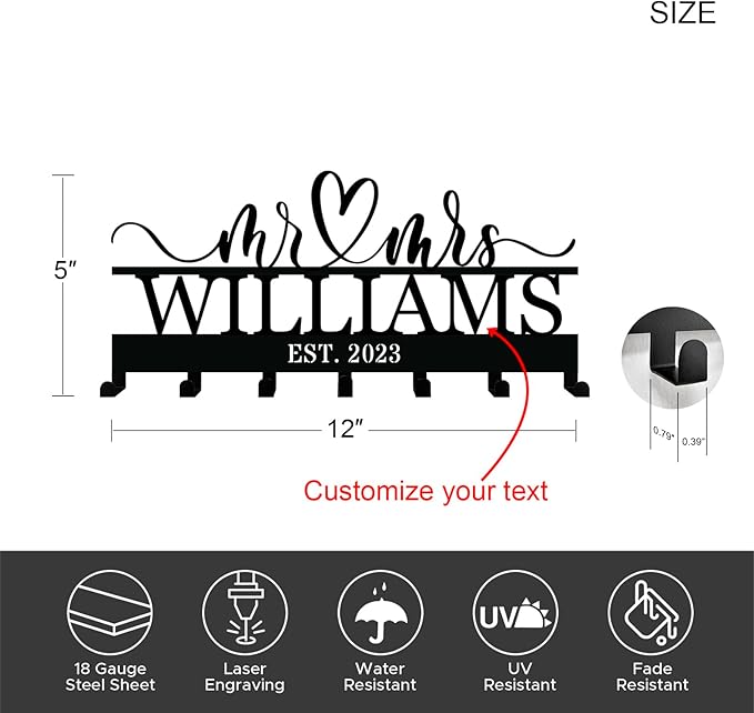 Custom Metal Key Holder for Wall – Personalized Couples Name Key Rack with 7 Hooks for Entryway, Front Door, Kitchen, Bathroom, Living Room, Bedroom, Mr and Mrs Gift