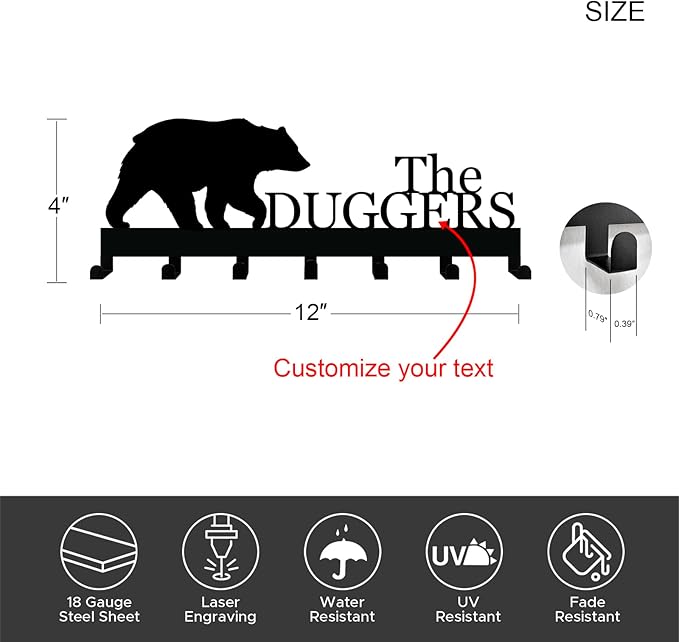 Custom Key Hook Rack for Wall – Personalized Family Name Metal Key Hanger - Bear Theme Organizer with 7 Hooks for Entryway, Front Door, Kitchen, Bathroom or Hallway Decor