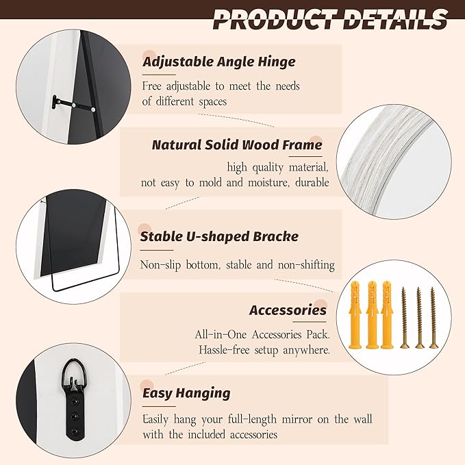 - Premium Wooden Frame - Our full length mirror is crafted from solid natural material with a smooth, vintage-style finish. The sturdy yet lightweight frame resists warping. The U-bracket is pre-installed and requires no assembly and is ready to use right out of the box