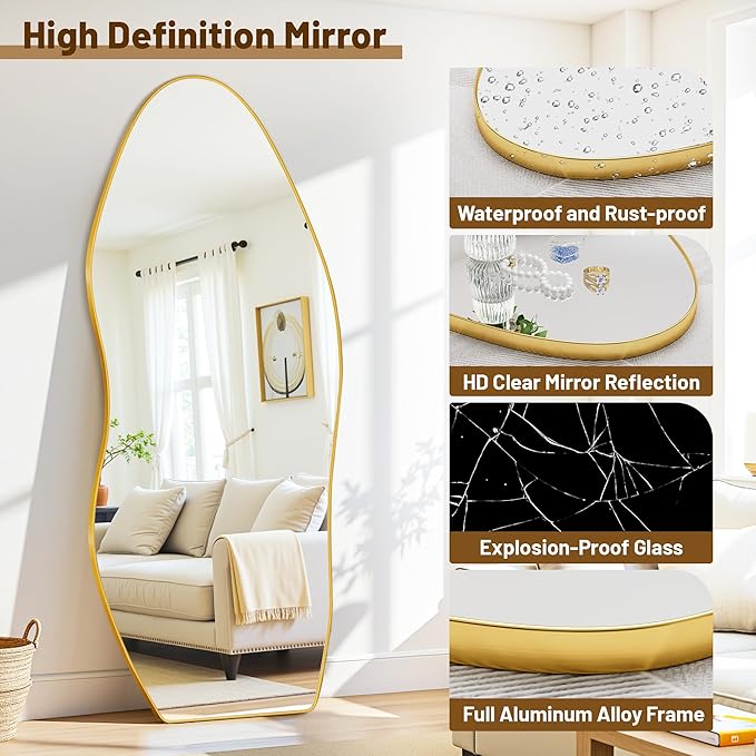 - Irregular Design: The Wave Full Body Mirror is perfect for giving you a comprehensive understanding of yourself. Three color options are available: Black, gold, silver, catering to different home styles and personal preferences, making it a standout in your home decor. The aluminum frame gives you a beautiful enjoyment.