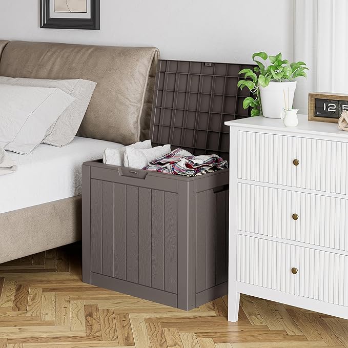 - 【Stylish Aesthetics】With 31 gallon capacity (22.08''L x 17.1''W x 20.86''H), this resin deck box combines rattan or wood grain textures for a modern rustic look. Its decorative design elevates your outdoor space while blending naturally
