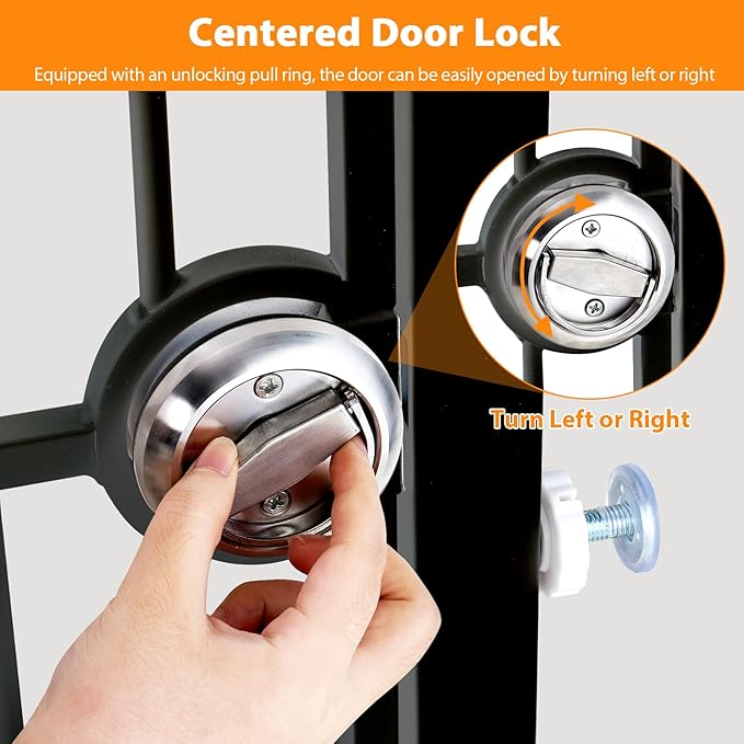 - Auto-Closing Pet Gate: Our extra-high pet door has an automatic closing function. When you open the door, it will automatically close no matter what the angle is. The maximum angle the door opens forward is 180Β°,What's more, our gate features a sliding button lock mechanism, guaranteeing steadfast security.