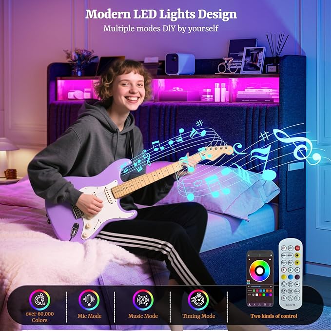 - Convenient Charging Station & LED Lights : Say goodbye to low battery anxiety! Built-in charging station on the storage headboard, equipped with 2 USB ports and 1 Type-C port for easy access to your devices. Elevate your bedroom ambiance with the RGB LED lighting, customizable via remote control or mobile app. You can adjust the color, brightness, mode to create the perfect atmosphere for any occasion