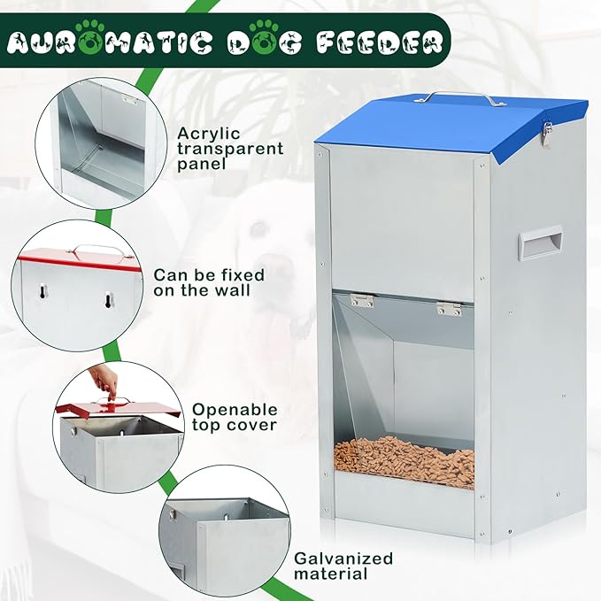 - Easy to Use: the galvanized gravity feeder for dogs comes with screws and installation instructions, which can be easily installed according to the instructions, and the top lid can be easily opened, which is convenient for to add feed and prevent the rain from wetting the food; Tips: there is a layer of paper film covering our acrylic sheet; When in use, please tear off the paper film and you can see the dog's eating situation