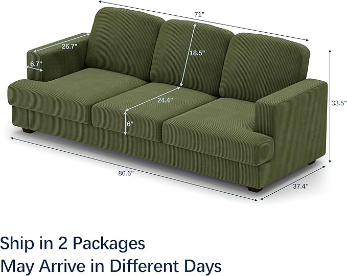 - Premium Corduroy Sofa: This 3-seat couch is crafted with premium, breathable corduroy fabric, celebrated for its exceptional softness, durability, and smooth, velvet-like texture. Designed to be both skin-friendly and wear-resistant, it delivers enduring comfort and timeless elegance. The high-quality fabric ensures the sofa retains its luxurious and modern appeal, making it a perfect blend of style and practicality for any living space.