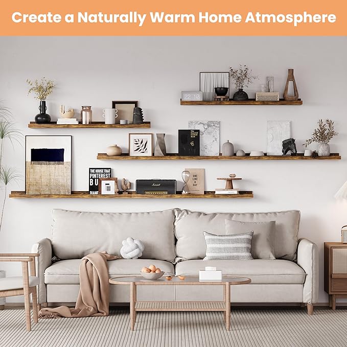 upsimples Floating Shelves for Wall, 47.3 Inch Shelves for Decor Storage Set of 6, Wall Mounted Wood Shelf for Bedroom, Living Room, Bathroom, Kitchen, Long Picture Ledge Shelves, Brown