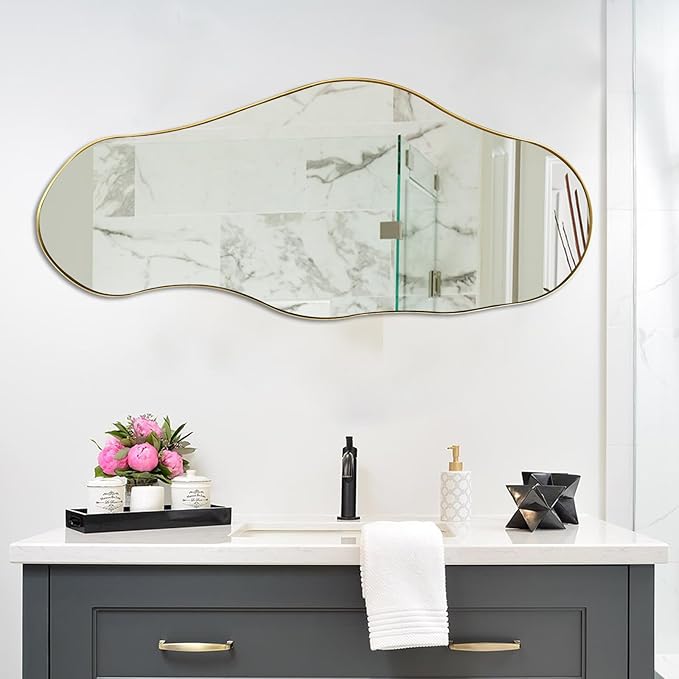 Irregular Mirror, 47"x20.5" Asymmetrical Wall Mirror with Gold Metal Frame, Large Abstract Mirrors Decorative, Modern Unique Shaped Mirrors for Living Room Bathroom Bedroom Hallway Entryway
