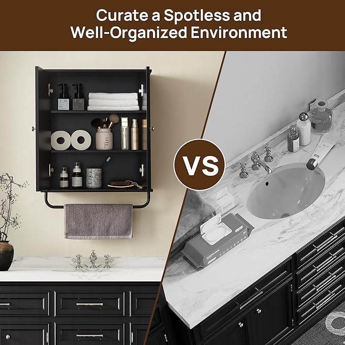 - 👆Enlarge Storage Space: With 22" W×27"H× 8" D,This above toilet storage cabinet design makes full use of wall space in the bathroom. The hanging bathroom cabinet saves floor space and is easy to clean. The towel bar can hang towels, ties, belts, etc. The wide design for towel bar of the above toilet storage cabinet allow you to have more hanging space.