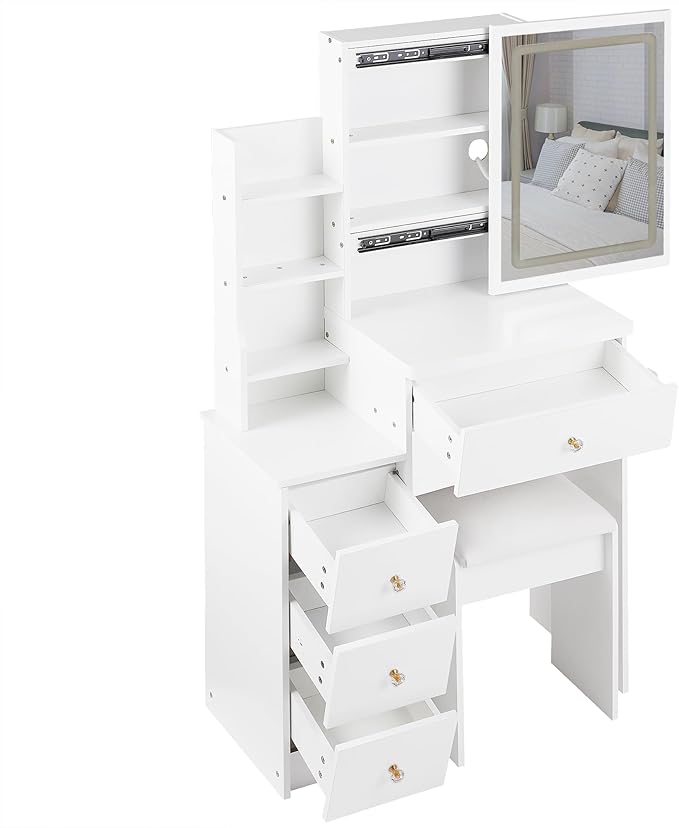 - 【Abundant Storage Options】Maximize your storage space with this kids vanity desk with mirror and lights featuring 5 roomy drawers, 2 adjustable open shelves with 3 levels, 1 hair dryer holder, and hidden compartments behind the mirror for organizing your makeup and necessities.The silver metal handles on the drawers make accessing your essentials a breeze.