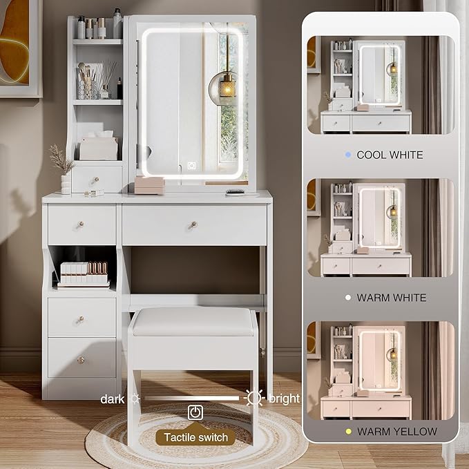 - 【Versatile LED Lighting Options】Achieve the perfect lighting for your makeup routine with our makeup vanity desk, featuring 3 color modes and adjustable brightness levels on the expansive sliding mirror with a convenient lamp switch. Simply tap the touch switch to select from white light, natural light, and warm light options.