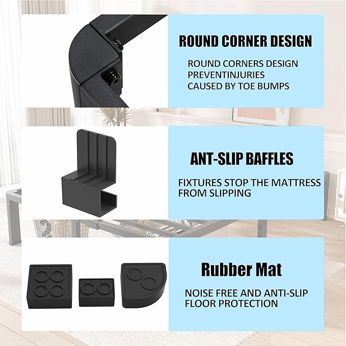 - NON-SLIP NOISELESS & ROUND CORNER DESIGN: The platform bed frame queen is designed with rounded corners prevent injuries caused by toe bumps. Rubber feet have a sound deadening effect and they prevent the metal bed frame from sliding for bed legs while avoiding the floor being scratched.