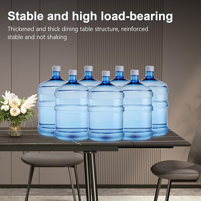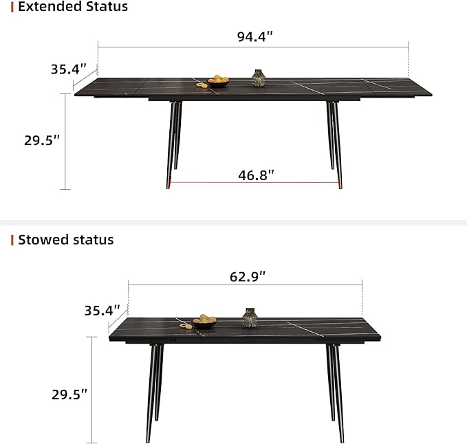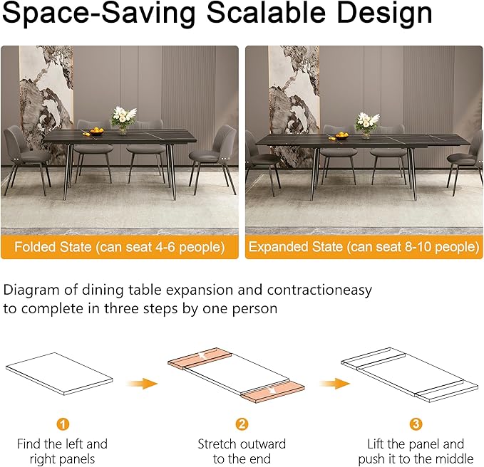 - 【Adjustable Length for Any Occasion】This dining table effortlessly extends from 62.9" to 94.5", making it ideal for family meals or hosting guests. The integrated slide track ensures smooth operation, while the high-quality sintered stone top resists scratches and heat.