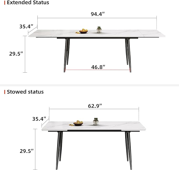- 【Adjustable Length for Any Occasion】This dining table effortlessly extends from 62.9" to 94.5", making it ideal for family meals or hosting guests. The integrated slide track ensures smooth operation, while the high-quality sintered stone top resists scratches and heat.